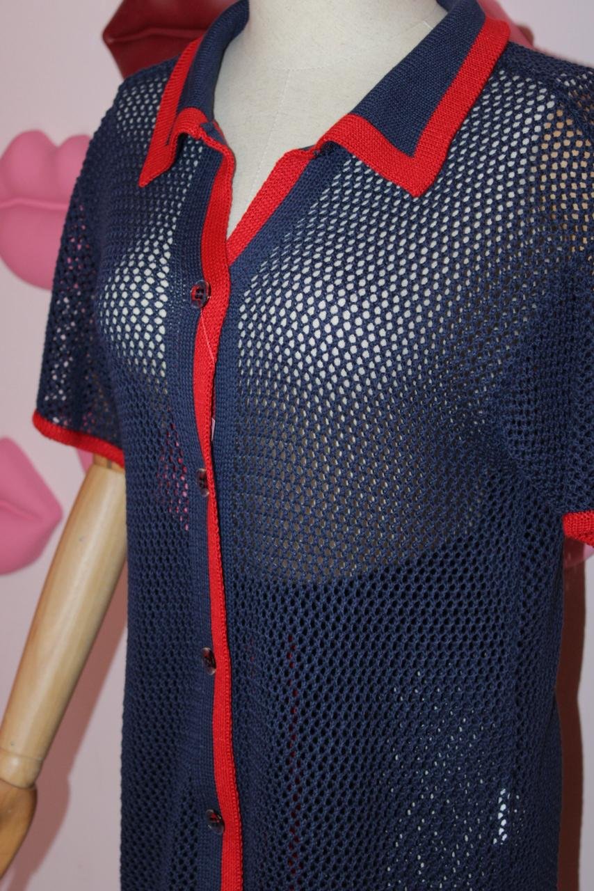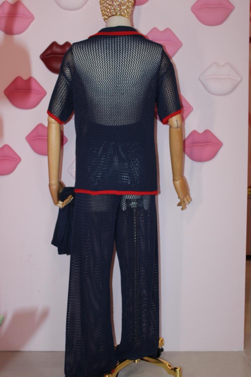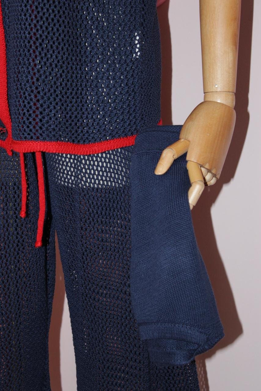 O conjunto em tricô azul e vermelho é a peça-chave para elevar seu guarda-roupa de verão. Com um design que remete à moda náutica clássica, ele combina o conforto do tricô com a sofisticação das cores marcantes. O resultado é uma saída de praia que oferece tanto leveza quanto um visual impactante. Use-o sobre o biquíni para um look elegante e despojado, ou combine as peças com outras do seu guarda-roupa para criar composições urbanas e cheias de personalidade.